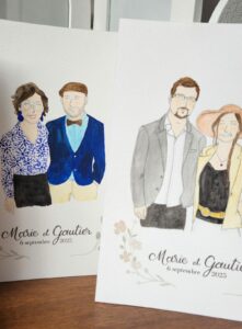 Information supplémentaire (qui a son importance) : pour les prestations de 3 heures et plus, je vous propose de réaliser le portrait des hôtes, du couple de mariés (etc.) à partir d’une photographie, en aval de la prestation. Ce portrait, sur lequel je travaillerai un peu plus longtemps, sera directement envoyé à l’adresse de votre choix !