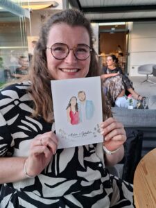 Les invités sont pris en photo par mes soins quand ils le souhaitent, afin de pouvoir profiter librement de l’événement sans avoir à poser. Les dessins sont réalisés sur du papier aquarelle au format A5 et peuvent comprendre 1 à 4 personnes maximum. Je peux illustrer 8 à 12 personnes par heure.